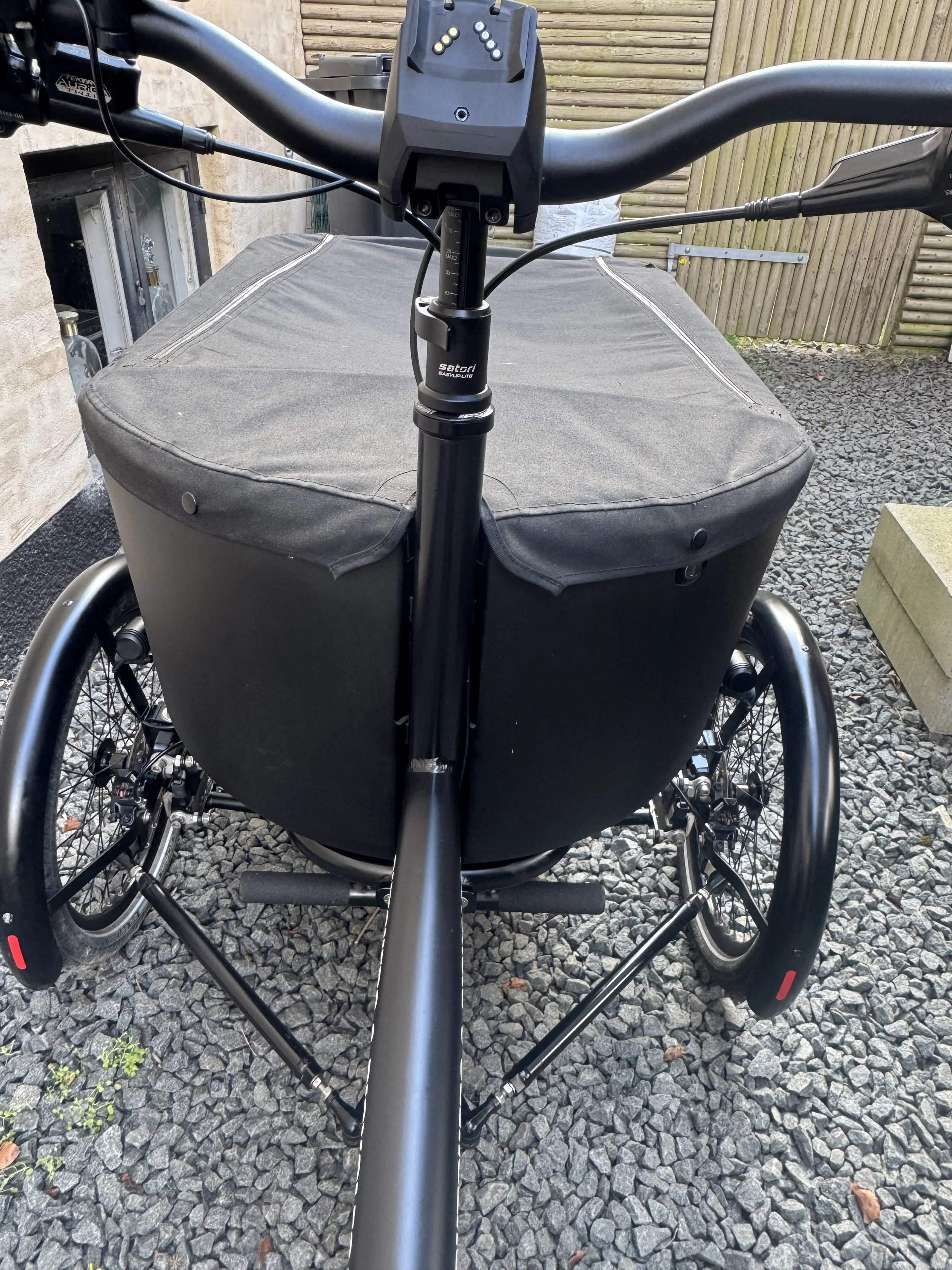 Så her står vi med en ladcykel, som har været igennem et meget omfattende service og en grundig gennemgang. Cyklen har fået et kæmpe service, hvor hele undervognen er blevet gennemgået, efterspændt og kontrolleret. Styretøjet er justeret og testet, så det drejer korrekt og jævnt, og alle bevægelige dele er efterset for slør og korrekt funktion.